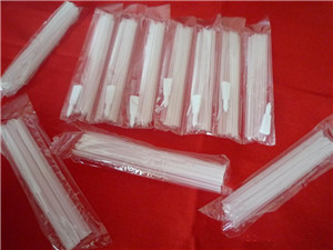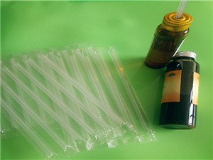 口服液吸管材質一般為PP或者PE。其特征是吸管的表面均勻分布著五至十二條棱,以八條棱為佳,這些棱與吸管口平面垂直立交,以便于穿透鋁箔吸口,使吸液暢順??诜何芘c普通的表面圓滑的吸管相比,用起來更加方便。